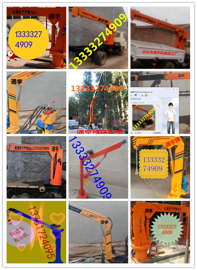随车吊组成与功能 随车吊一般由载货汽车底盘、 随车吊配件、货厢、取力器、吊机组成。 随车吊是一种通过液压举升及伸缩系统来实现货物的升降、回转、吊运的设备,通常装配于载货汽车上。 随车吊维护说明 由于随车吊是车辆,操作人员应接受生产厂家的指导、培训,对整车的结构、性能有足够的了解,并从厂家获得 的随车吊操作及维护经验方可操作机器。生产厂家提供随车吊的产品使用维护说明书,是随车吊操作者操作设备的 资料,在操作机器前, 要先阅读随车吊的使用维护说明书,按说明书的要求进行操作、保养随车吊。操作人员应注意经常检查冷却液、润滑油、制动液、液压油以及燃油油(水)位和品质,并注意检查整车的密封性。随车吊在磨合期内使用保养的要求,可归纳为:减轻负荷、润滑、加强培训、注意检查。只要操作人员重视并按厂家要求对随车吊磨合期进行保养和维护,就会减少随车吊早期故障的发生,延长使用寿命,提高作业效率,让随车吊为您带来 大的收益。同时,应随车吊各润滑点的润滑,建议在磨合期内,每班都要对润滑点加注润滑脂要求除外。 因此,在随车吊磨合期内容易造成零部件(特别是配合表面)的磨损,磨损。这时,如果超负荷作业,则可能导致零部件的损坏,使随车吊产生早期故障。